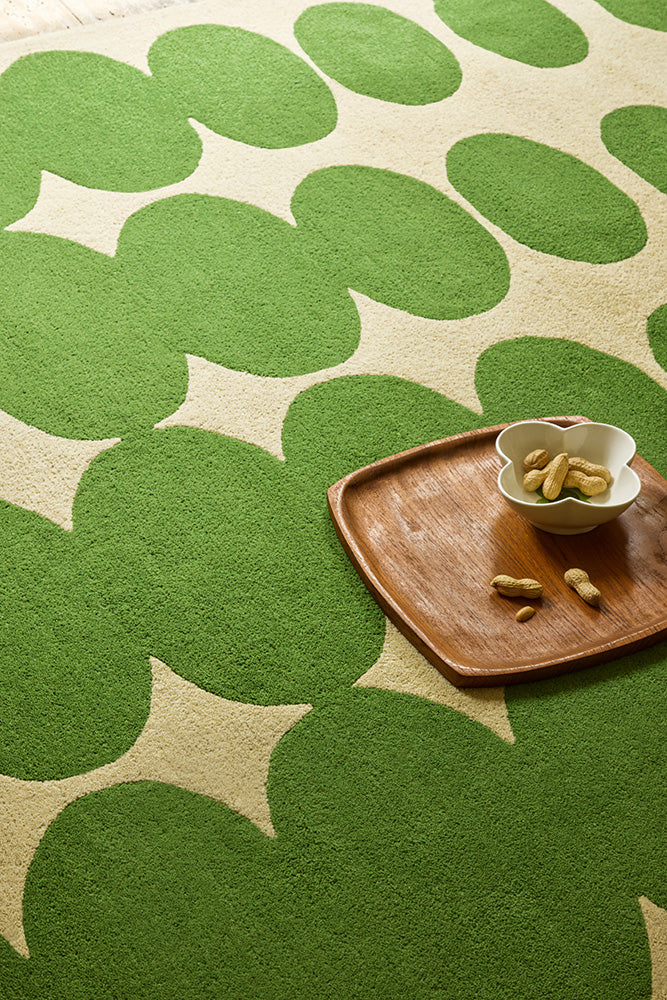 This retro optical oval pattern rug by Orla Kiely has green and cream tones that inject warmth and character without overpowering. Hand-tufted in India from 100% pure new wool, these rugs feature a 17mm pile for cushioned comfort.